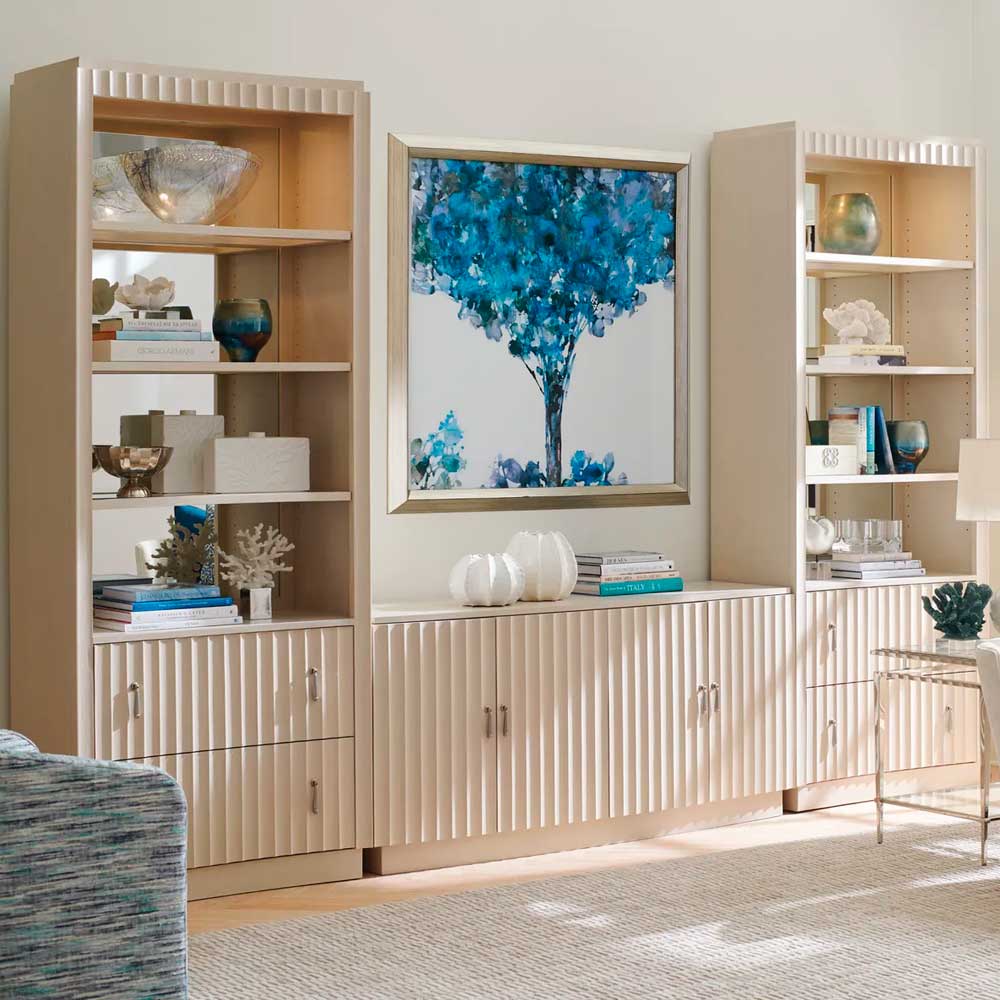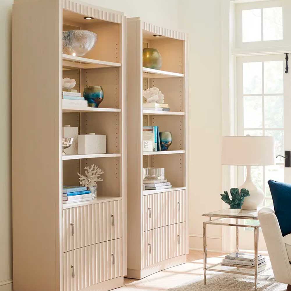 The Walden bookcase features a gentle concave front, three wood-framed adjustable glass shelves, and touch LED lighting. In the lower section, two full-extension file drawers accommodate both letter and legal files. The cabinets may flank the bowfront Ellerston media console for a beautiful look. The cabinets also pair with the larger San Marcos media console.