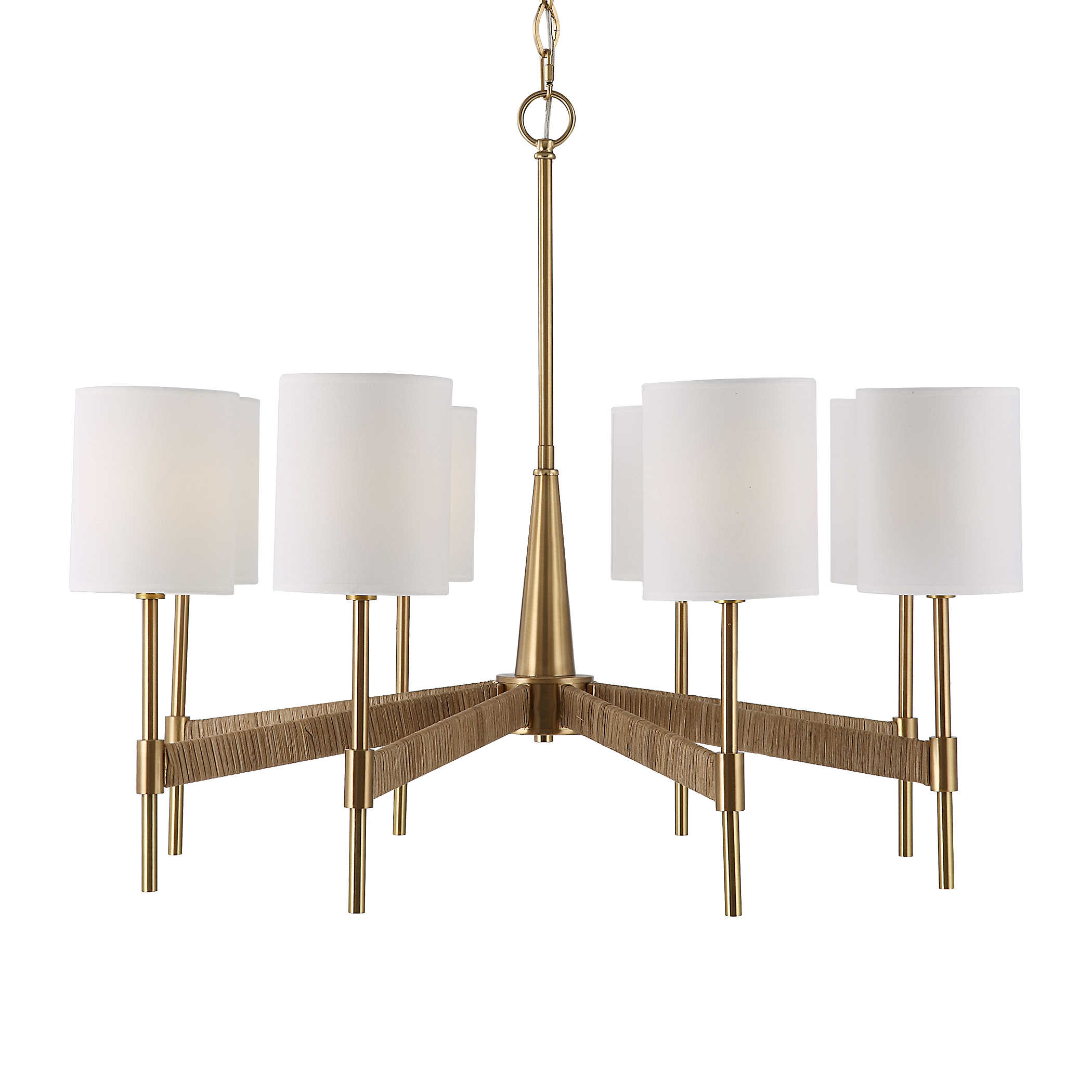 Chandelier featuring rattan wrapped arms dressed up in a warm brass finish complimented with white linen hardback fabric shades. 8-60 watt max candelabra sockets. 26 H X 32 Dia. (in)