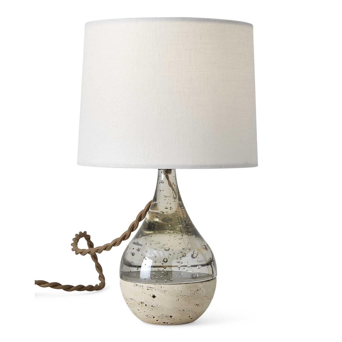 Half champagne optic crystal with a bubble pattern, half beige unfilled travertine, this mini lamp encapsulates the best of both texture worlds. A French cord drapes from the light socket and leads to the in-line dimmer