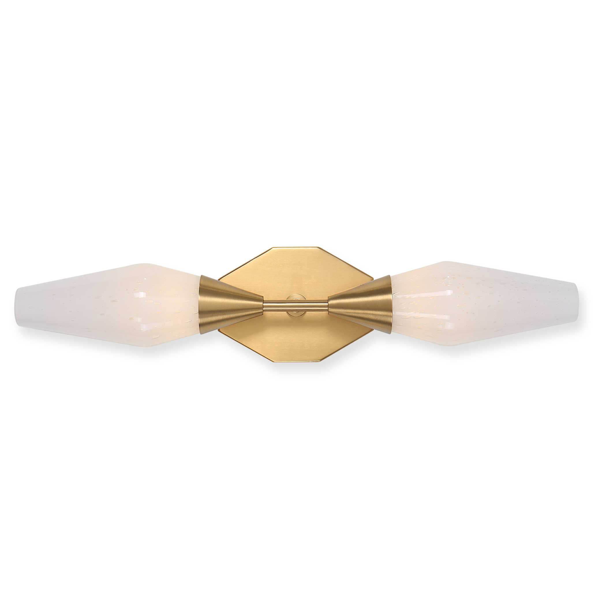 Hand blown, white seeded glass, in the shape of a closed bloom, directs the light vertically. The rich brass-finished sconce can also be hung sideways over a vanity for a horizontal glow. 23 H X 5 W X 4 D (in)