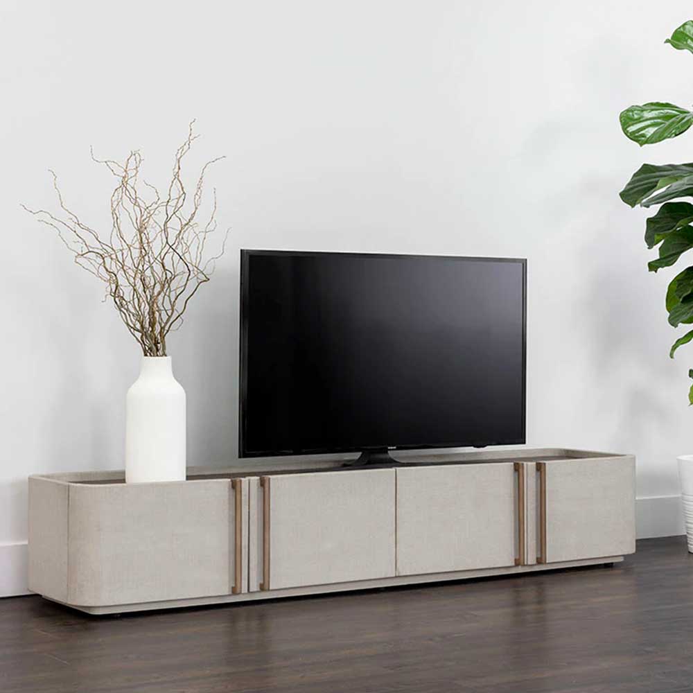 This contemporary media console and cabinet is defined by its beautiful and gentle curves. Upholstered in cream faux leather with a brown oak veneer tabletop that is sure to impress. Includes four cabinets and completed with a warm brass steel base. Coordinating console table, desk, and sideboard also available. Handle With Care: This design has been crafted with faux leather. Faux leather is manufactured to reflect the natural characteristics of leather; as such.