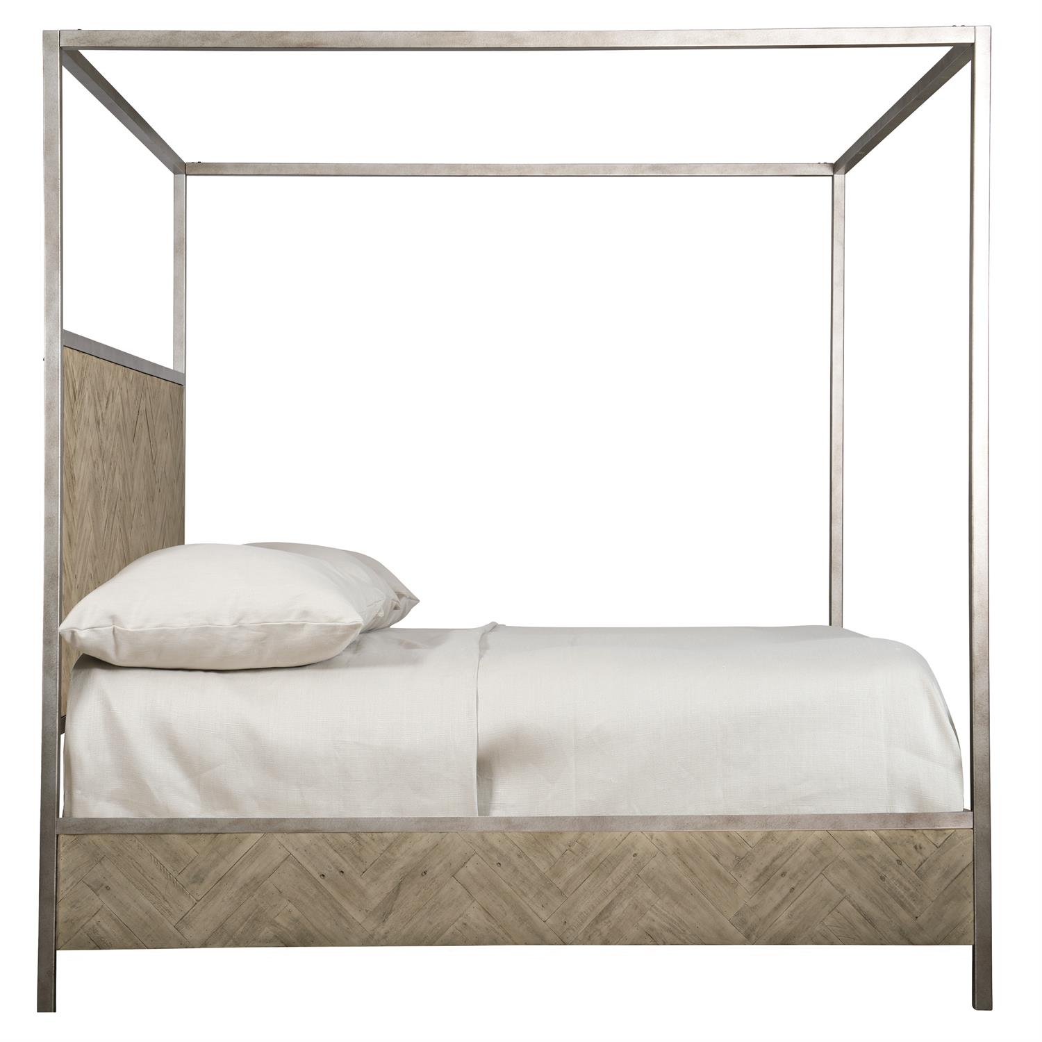 With hints of farmhouse and mid-century styling, this eclectic canopy bed pairs distressed pine with silver-glazed metal. W: 81 in D: 85 in H: 86 in