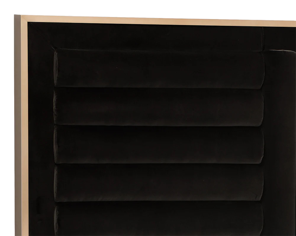 Upholstered in our abbington charred brown fabric with horizontal and vertical tufting on the headboard. Finished with gold feet. No box spring is required and folding slats are included.
