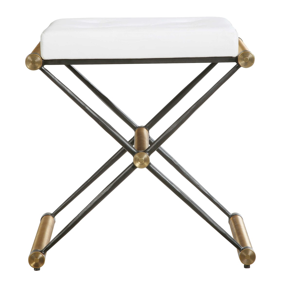 Two x-shaped iron legs are joined with five reeded polished brass rods and medallions. Removable cushion covered in white leather is diamond tufted. Seat height is 21". 19 W X 21 H X 15 D (in)