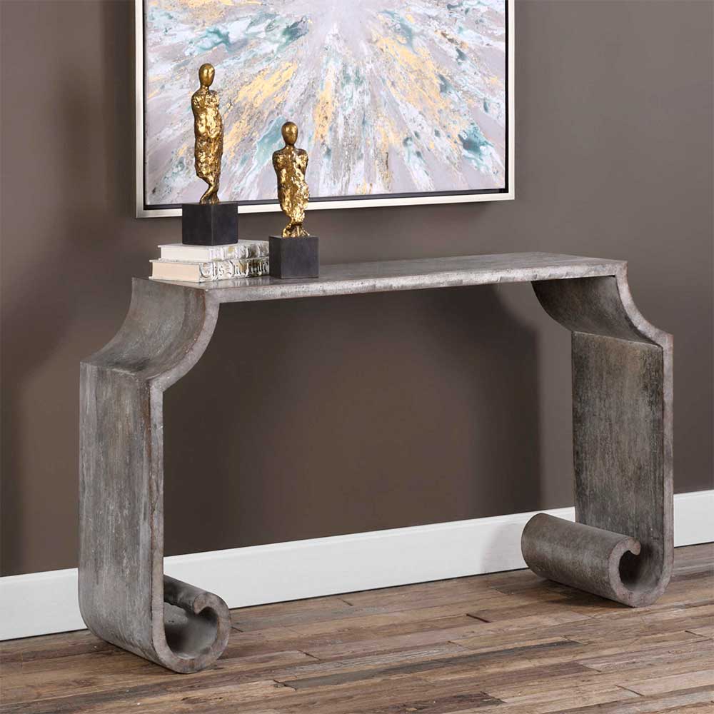 Ancient scroll legs are the focal point of this table, made from zinc sheeting with a heavily oxidized acid wash with tones of rust bronze and aged stone gray. Dimensions:52 W X 32 H X 14 D (in)