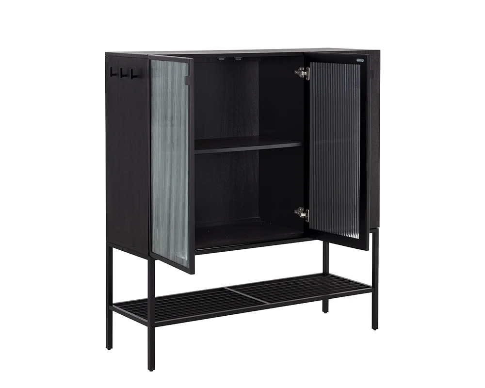 Stay organized with this large entryway cabinet that features a beautiful mid-century modern design. Crafted from black acacia wood with clear fluted glass cabinets. Includes hooks on both sides and a lower shelf compartment for added functionality. Completed with a matte black metal base. Also available in a small size.