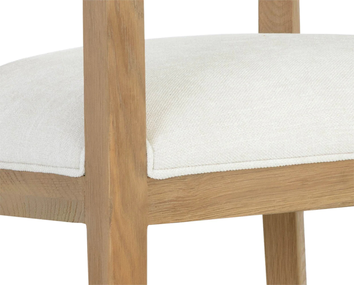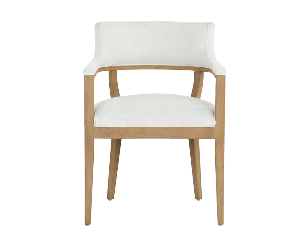 A mid-century modern dining armchair chair with an open back design. Stocked in heather ivory tweed performance fabric with an exposed solid oak wood frame in a natural finish. Performance fabric is moisture repellent, durable and easy to clean. As wood is an organic, porous material, these pieces will contain natural variation of texture and may also exhibit fine indentations and cracks. Wood pieces will also display a disparity of colour and grain, and visible knots and burls that add to the character of each piece.