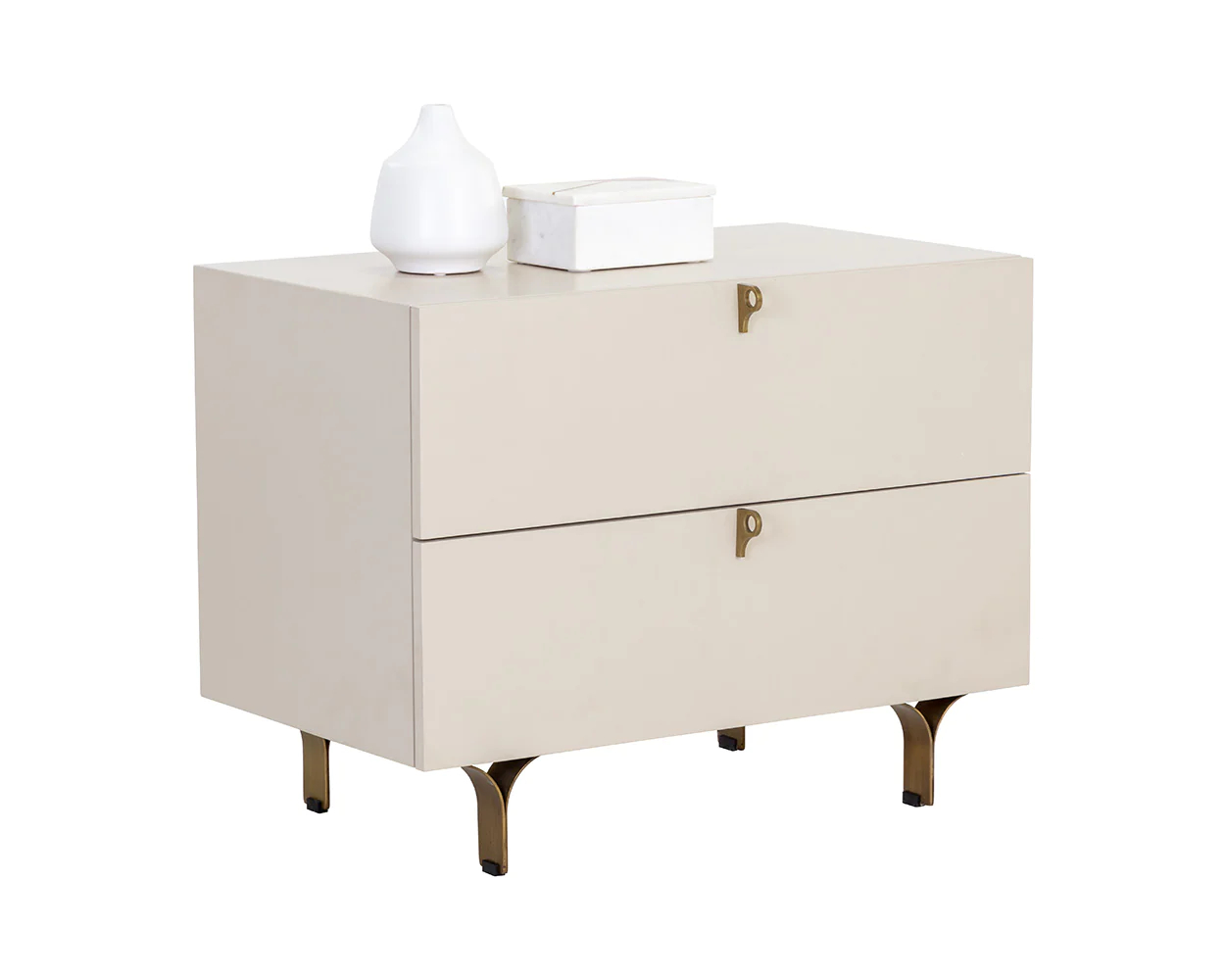 Add beauty to your bedroom oasis with this large, stylish nightstand. Designed with two soft closing drawers crafted from rubberwood, featuring a subtle wood grain texture and a painted cream finish. Uniquely sculpted antique brass feet and drawer pulls complete the look. As wood is an organic, porous material, these pieces will contain natural variation of texture and may also exhibit fine indentations and cracks. Wood pieces will also display a disparity of colour and grain, and visible knots and burls that add to the character of each piece.