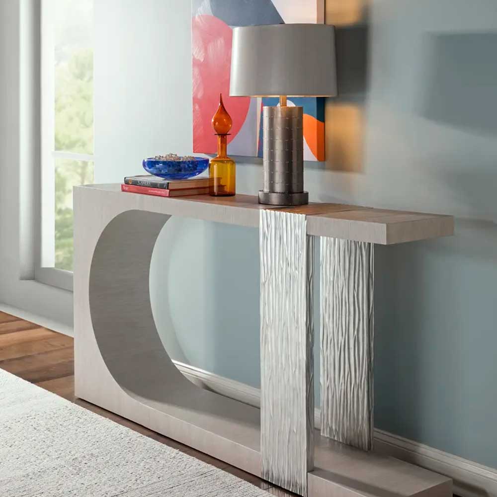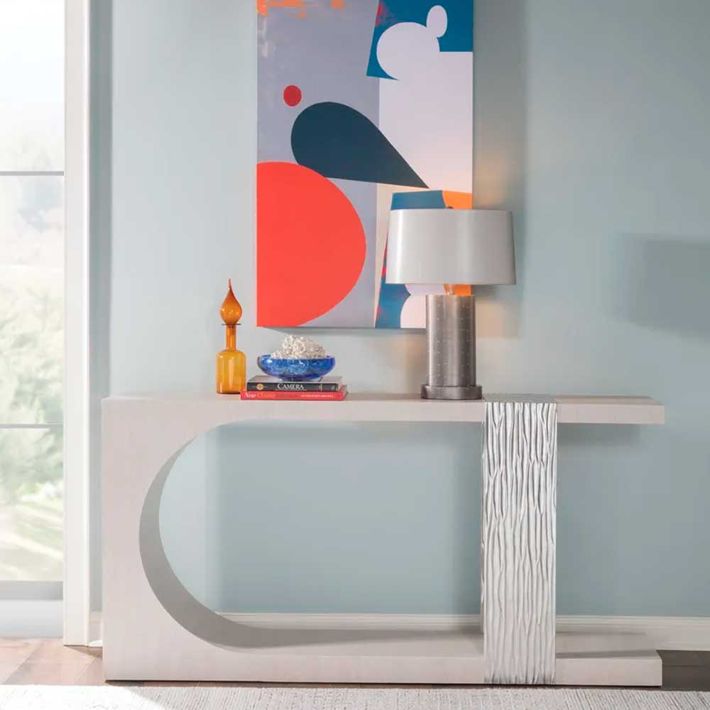 Contemporary asummetrical design in a deeply sandblasted quartered oak veneers in a misty white gray oak finish with silver leaf organic casting. Decorative architectural design with organic casting accent in a silver leaf finish and finished back.
