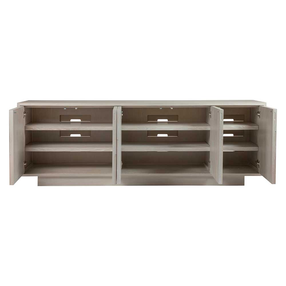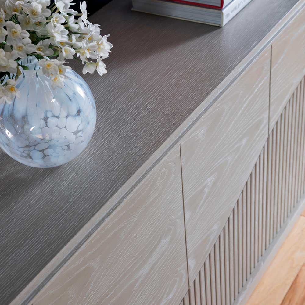 Modern designs of fluted quartered white oak contrasted against a burst of flat cut veneers, forming a landscape pattern across the five doors in a light taupe finish with ivory ceruse. Recessed plinth and two adjustable shelves behind soft-close hinges in each compartment, with ventilated removable back panels.