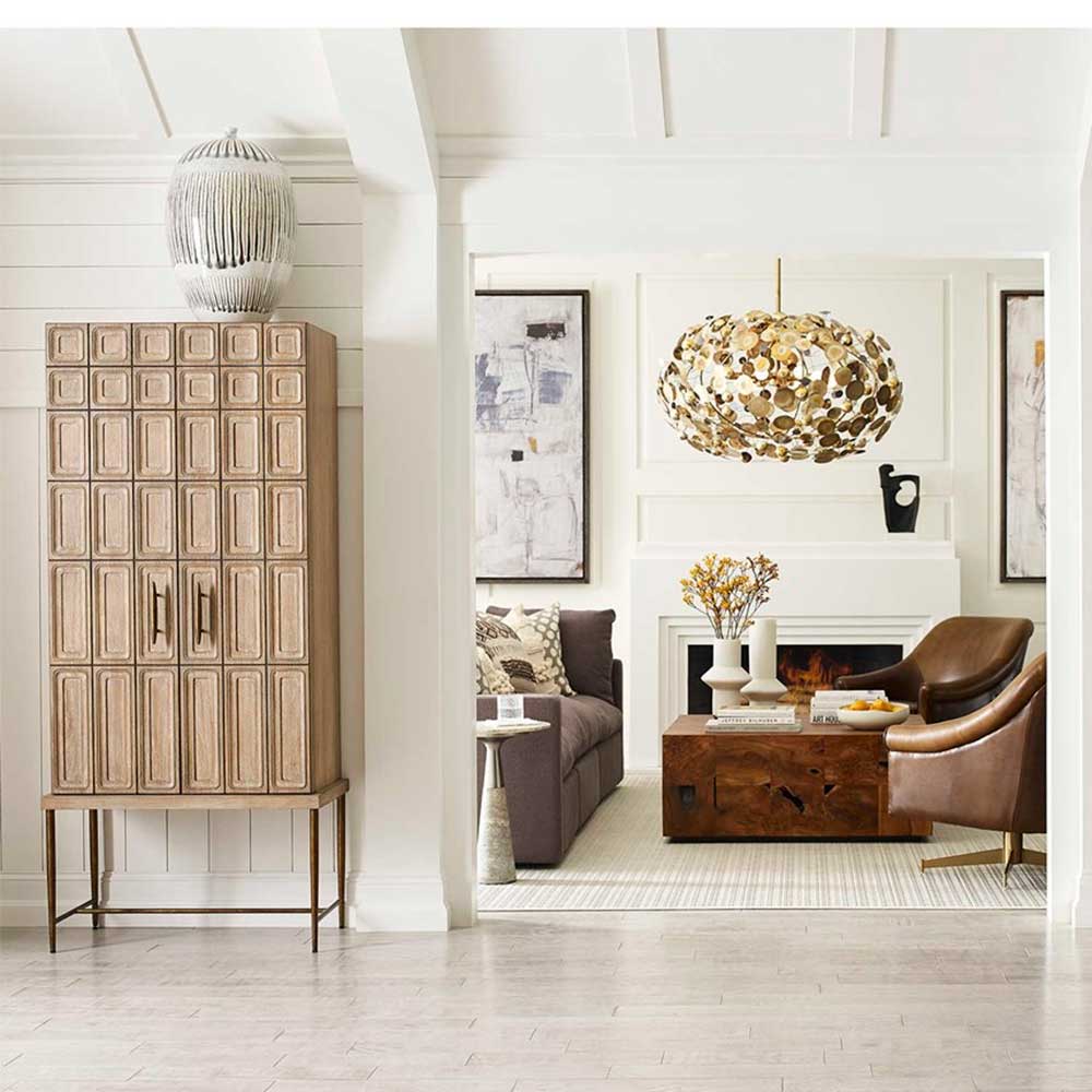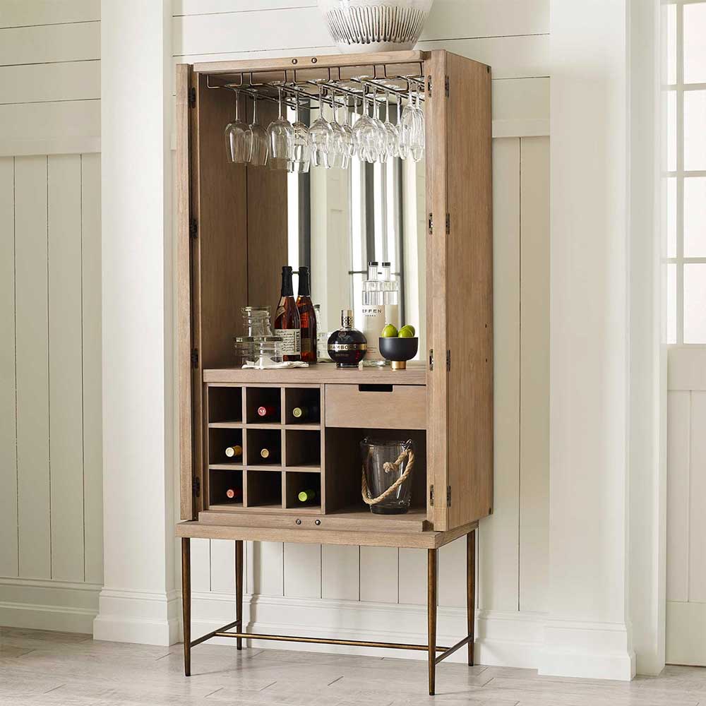 Influenced by the buildings of Brasilia, the capital of Brazil, this cabinet's architectural grid artfully camouflages two large doors with gold-finished tapered pulls. The interior houses a five-row wine rack, nine-bottle holder, storage drawer, open storage, a wide serving space and a mirrored back.