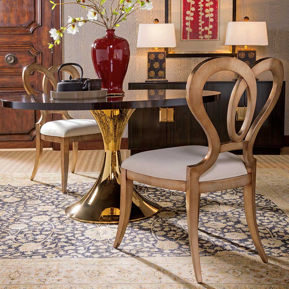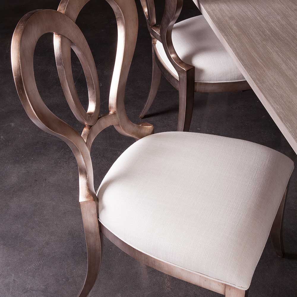 Solid Mahogany frame in a warm silver leaf finish. The upholstered seat is available as shown in a linen weave with a soft hand in a natural vanilla coloration, fabric. 22W x 25D x 38H in.