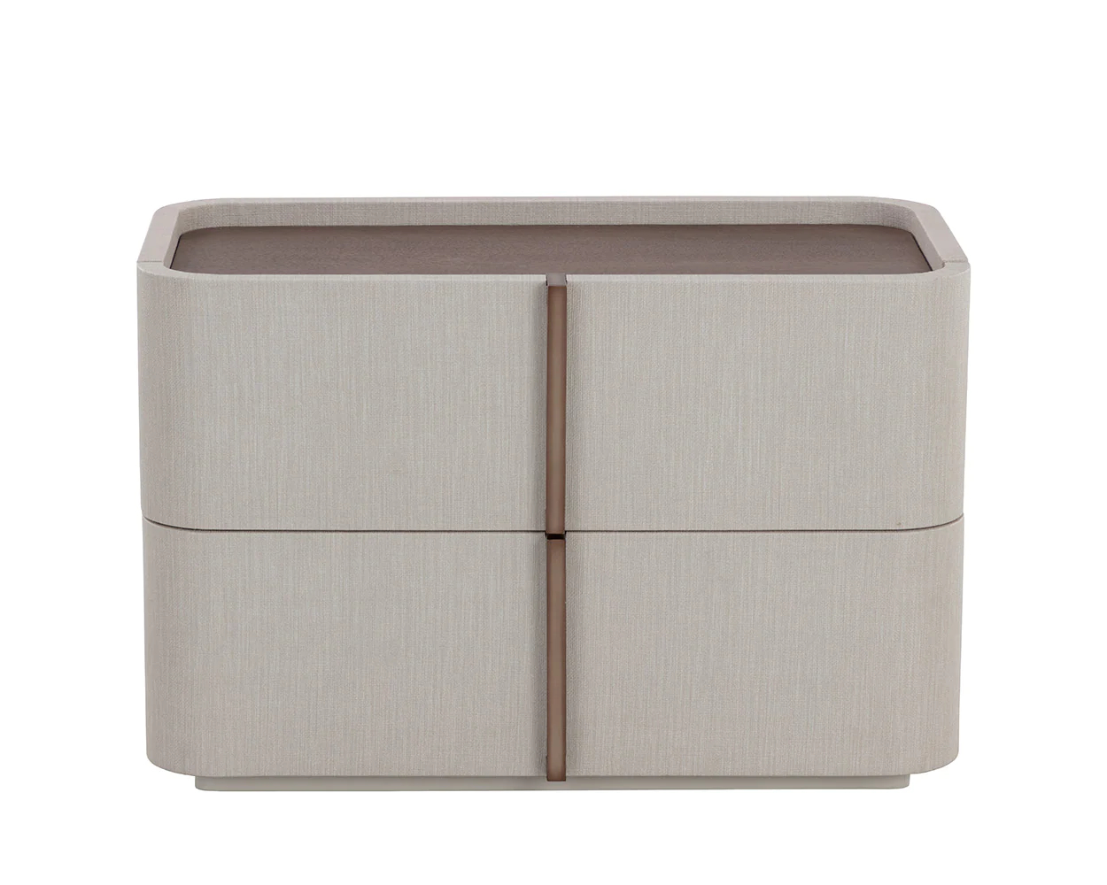 This contemporary large nightstand is defined by its beautiful and gentle curves. Upholstered in cream faux leather with a brown oak veneer tabletop that is sure to impress. Includes two drawers and completed with a warm brass steel base. Handle With Care: This design has been crafted with faux leather. Faux leather is manufactured to reflect the natural characteristics of leather; as such, colour variations, markings wrinkles, grooves, and light scratches are appreciated characteristics.