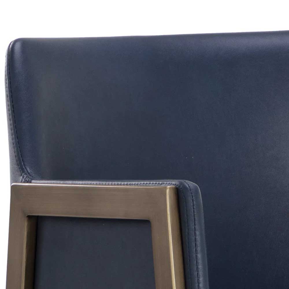 The Bernadette Barstool features a shapely design with a powder-coated antique brass frame. Upholstered in bravo admiral faux leather for added style and durability. Handle With Care: This design has been crafted with faux leather. Faux leather is manufactured to reflect the natural characteristics of leather; as such, colour variations, markings wrinkles, grooves, and light scratches are appreciated characteristics. No two pieces will be alike.
