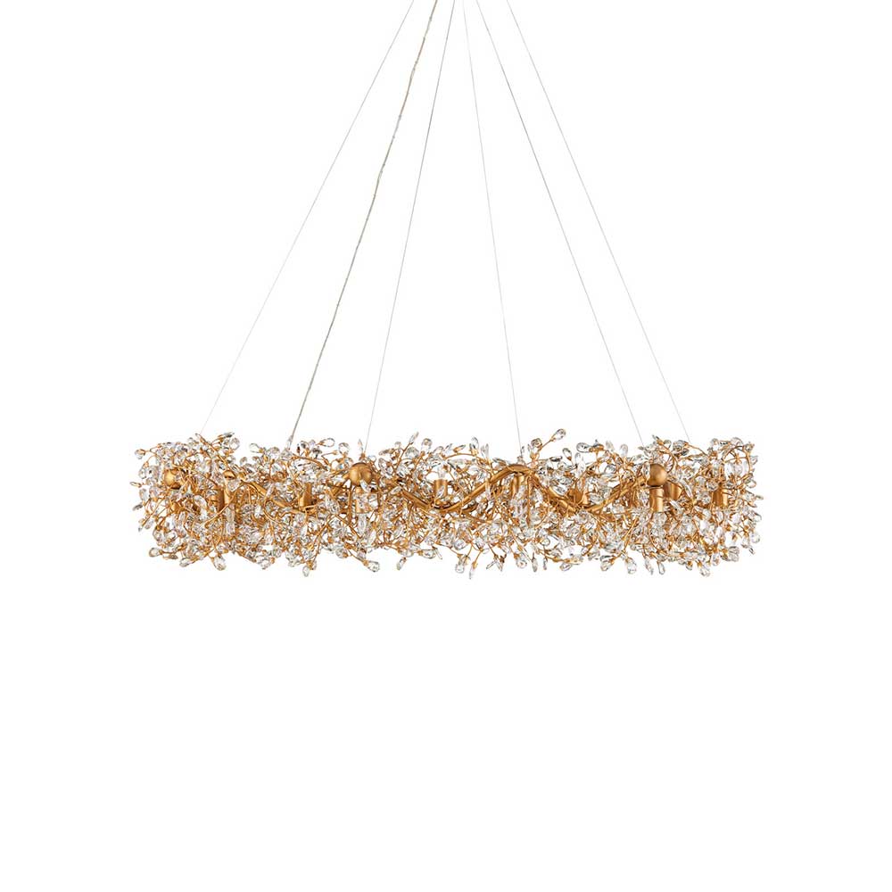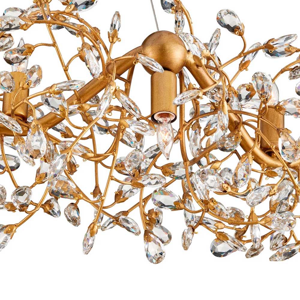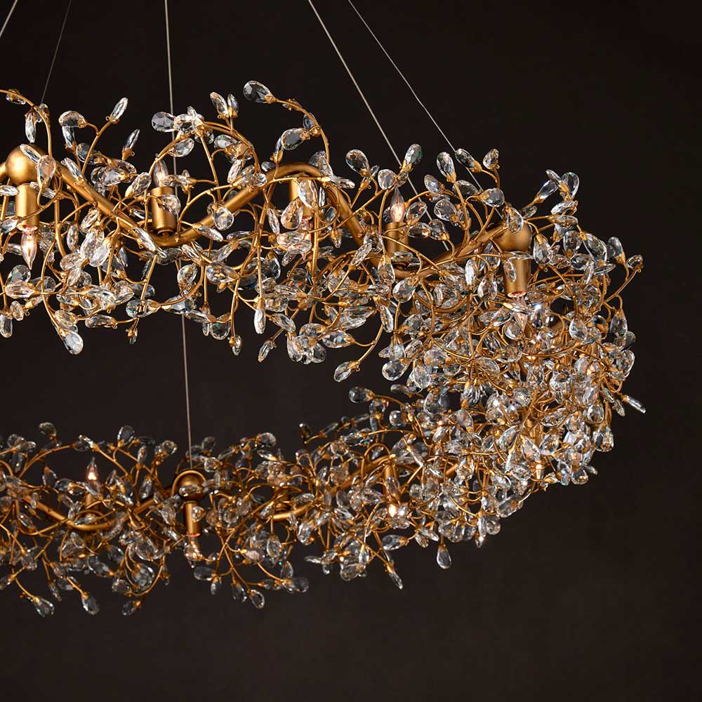 The Crystal Bud Grande Ring Chandelier has delicate faceted crystals unfurling from vines that flow around the fixture. The gleaming metal in a brass finish serves as a warm contrast to the luminous crystals; the interplay making the profile of this fixture complex and interesting. This stunning crystal chandelier is nearly 50 inches in diameter and the lights alternate pointing up and down to increase the sparkle and the luxurious aura.