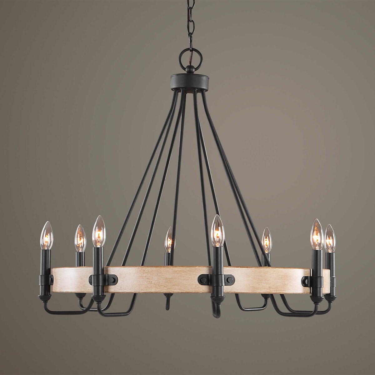 A warm vintage farmhouse feel with industrial flair is brought to life through a sanded black finish with faux painted wood ring with exceptional character. 8-60 watt max candelabra sockets. Bulbs not included. Supplied with 12' wire, 5' chain for adjustable installation.