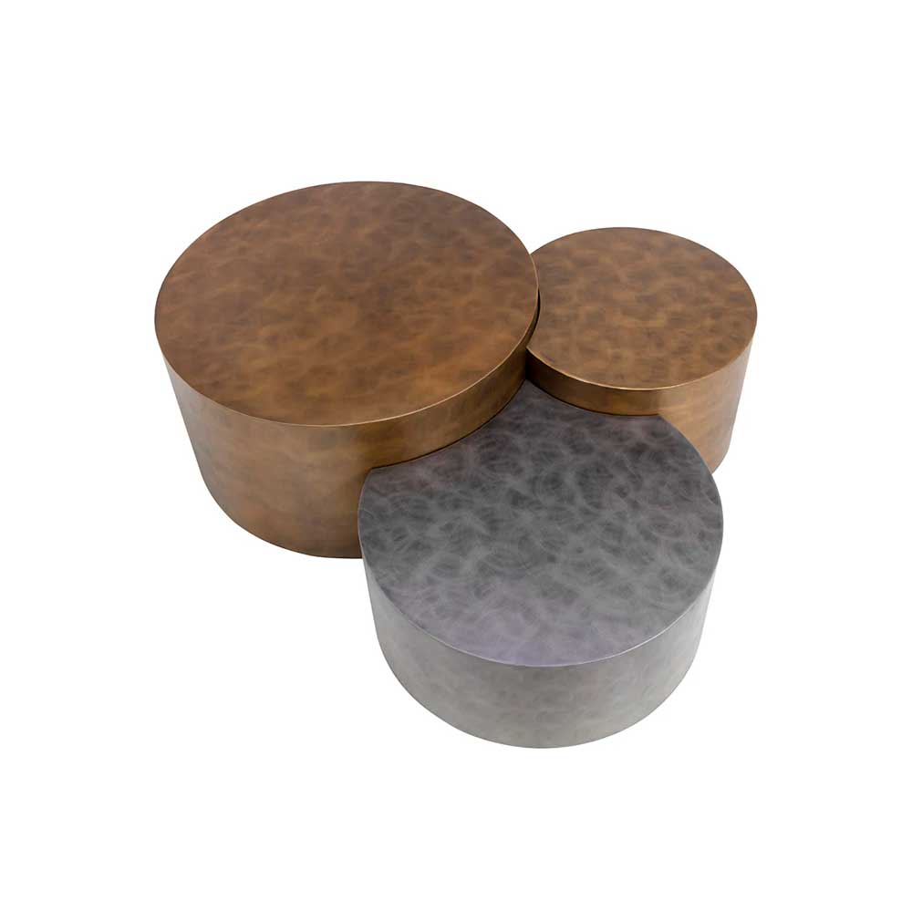 Three metal pieces designed to fit together at staggered heights and in varying antique brass and nickel finishes. Each table top has a handmade swirl pattern that is unique to each piece and will vary. Function and dimension at its fines
