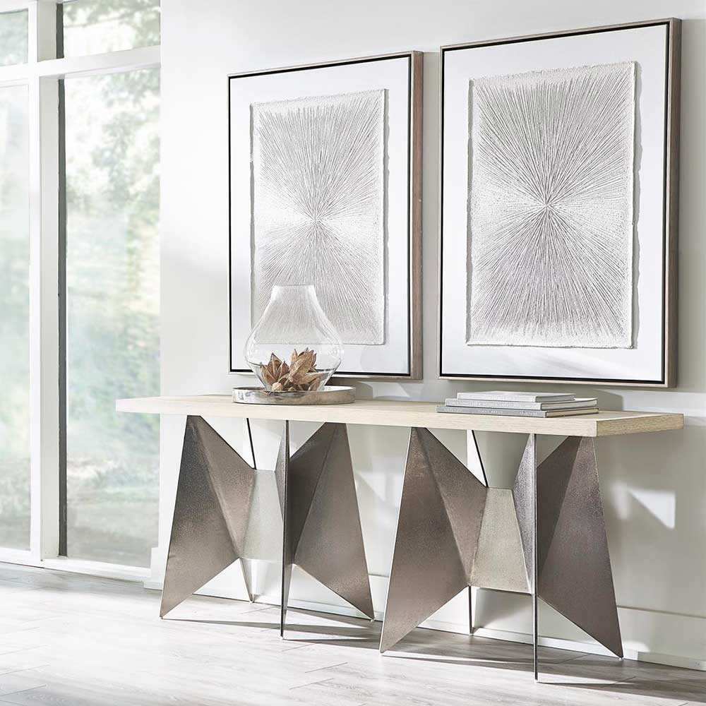 Geometric shaped metal bases provide stuninng support on this console table. W: 72 in D: 19 in H: 29 in