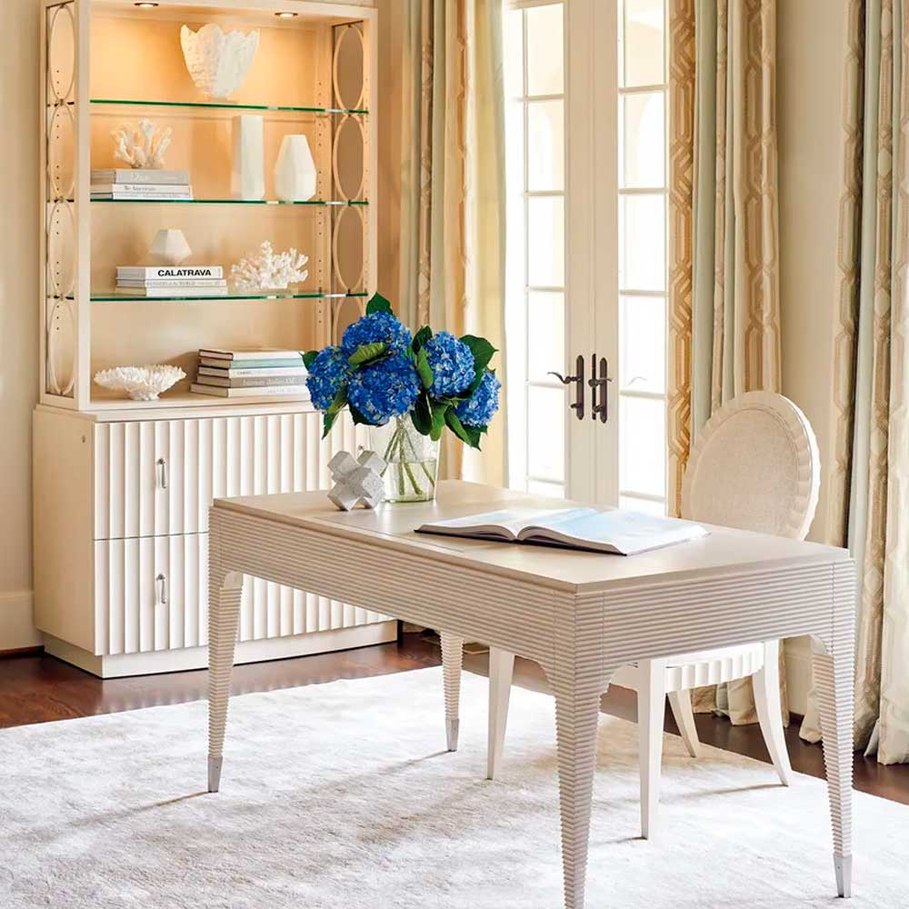 The Roslyn writing desk features horizontal tambour molding around the perimeter and down the saber legs. There are three full-extension storage drawers and an inset leather writing surface in the top.PRODUCT DESCRIPTION: