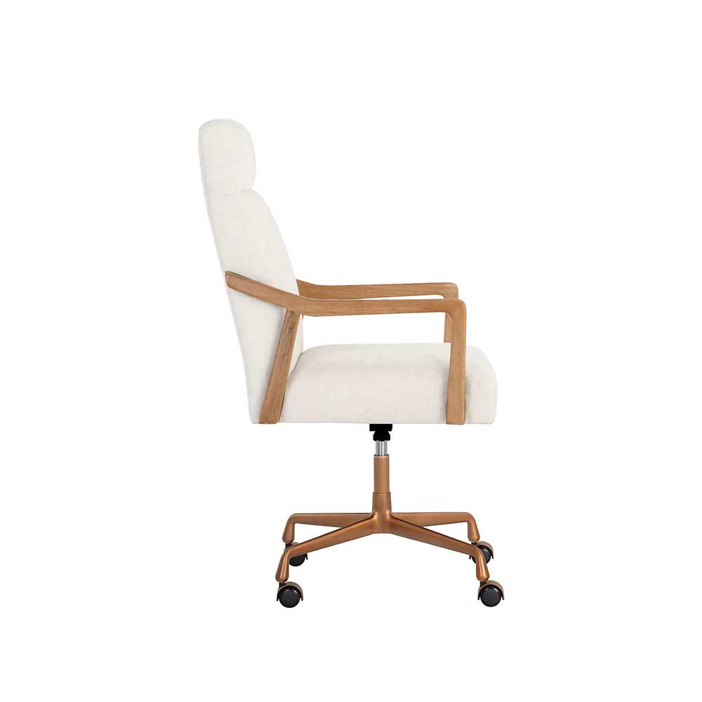 The exposed natural oak wood arms and brushed gold base offer an airy element while paired with heather ivory tweed performance fabric.