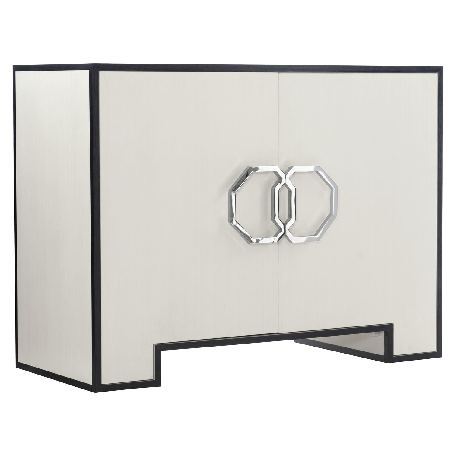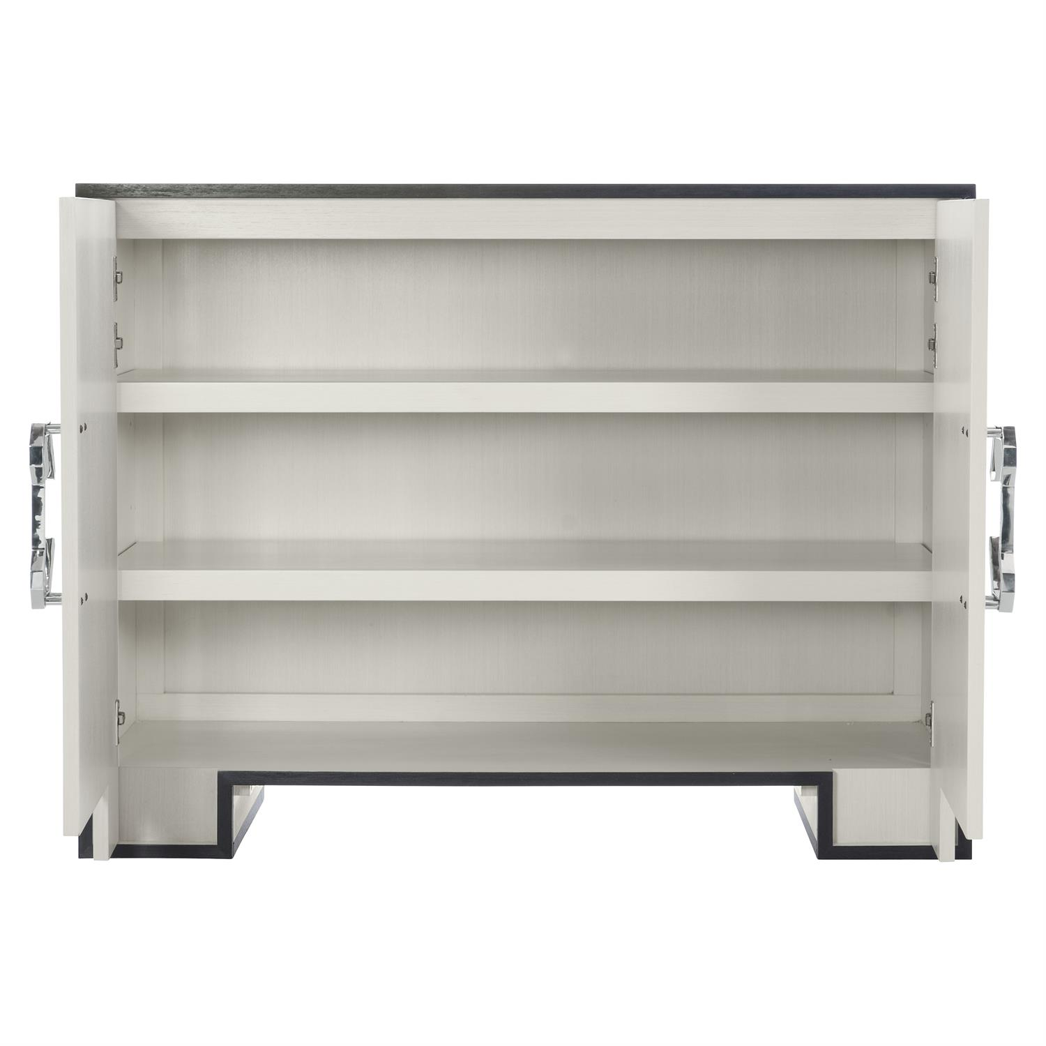The sleek linear form of this door chest finds balance with contrasting finishes and geometric pulls. W: 45 in D: 20 in H: 34 in