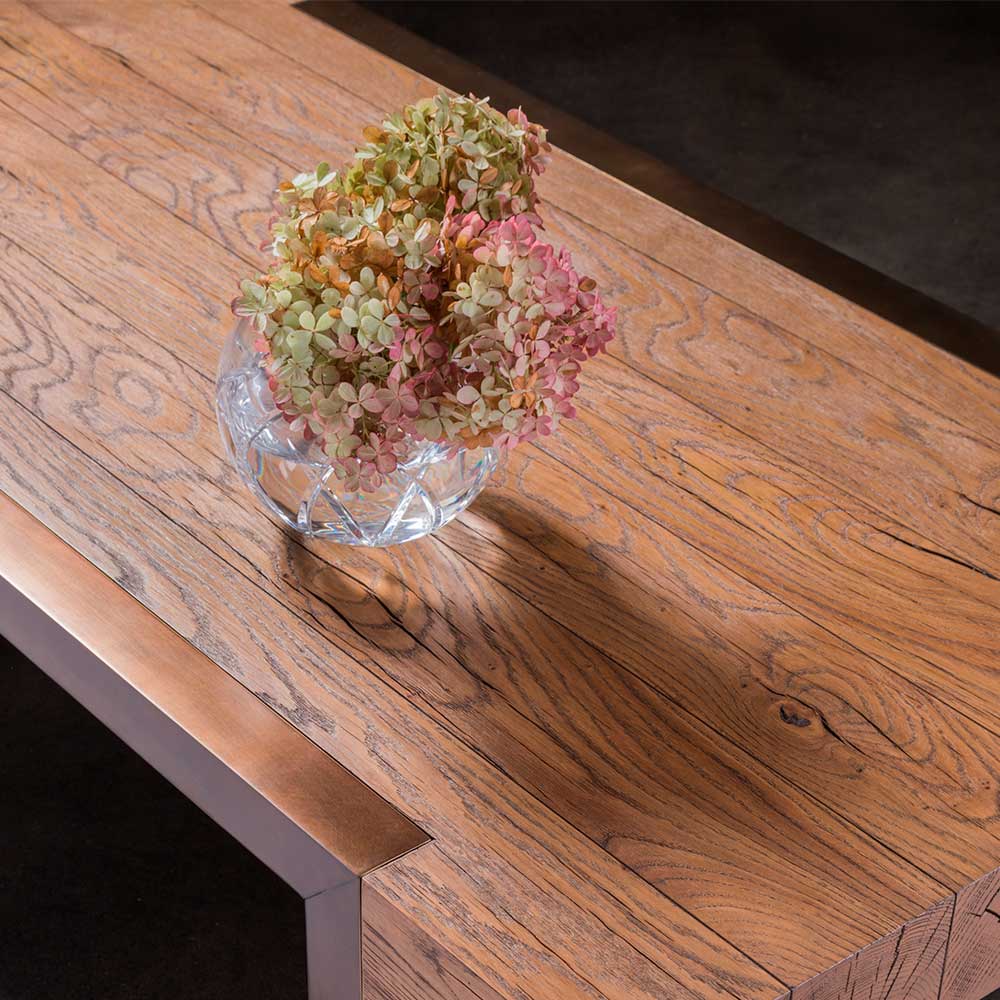 Modern Organic designs crafted from 5mm sawn French Oak veneers and select hardwoods in a honey brown finish with an aluminum base in a bronze finish.