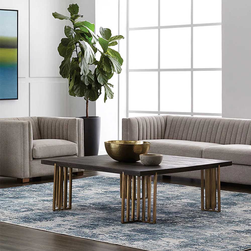 This square coffee table will bring warmth and style to various living and lounge spaces. The distressed oak wood veneer top is complemented with architectural antique brass iron legs for added appeal. Cracks and deep lines in finish are part of the distressed look. Suitable for residential and contract environments.