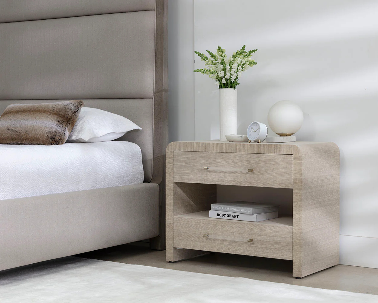 Fusing modern style with a design inspired by global travels, this richly textured nightstand will add definition to any space. Crafted from a wooden frame with a sand raffia covering. Features two soft-closing drawers with steel and clear acrylic handles. Anti-tip kit included. Handle With Care: This design has been crafted with raffia. Each item will exhibit unique traits such as texture and thickness variations that add to the natural character of this finely woven material. Visit our Product Care page for more information on how to ensure the lasting beauty of this piece.