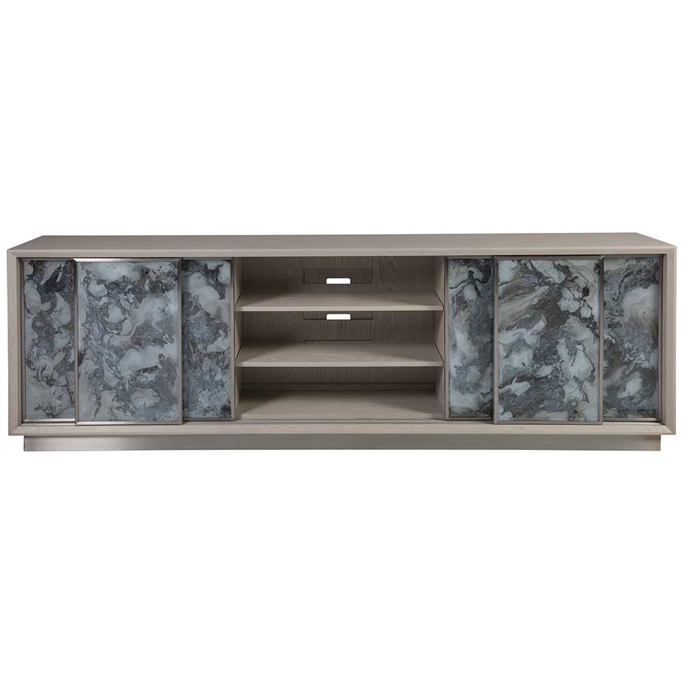 Contemporary design crafted from white oak solids and select hardwoods in a white sandblasted finish. The six sliding doors have original artist Eglomise panels, with brushed stainless steel door frames and a plinth base. Behind the doors are six adjustable shelves and a ventilated removable back panel. Exact image is unavailable. Image shown is the demi-sofa, which is size between a sofa and a loveseat.