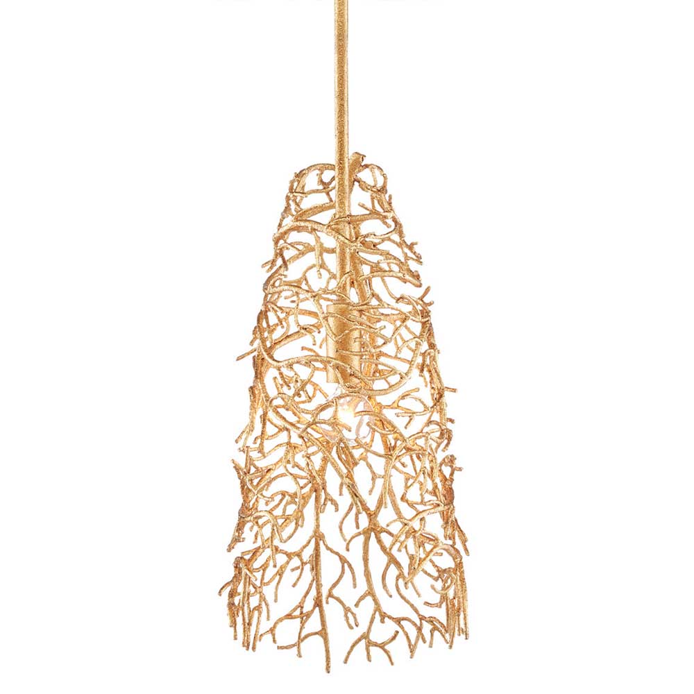 Sprays of wrought iron in a gold gilt finish flutter down around the light source on the Sea Fan Pendant, designed by Aviva Stanoff. She says of the inspiration for the design of this gold chandelier, "When I had my DNA test done, it turned out I am 12% mermaid! As a native Californian, the sea has always been by my side and has kept my secrets. I have a deep reverence for nature and particularly the ocean, and sea fans that live underwater remind us that we live among tides, that life is cyclical, and that there is beauty in believing in magic."